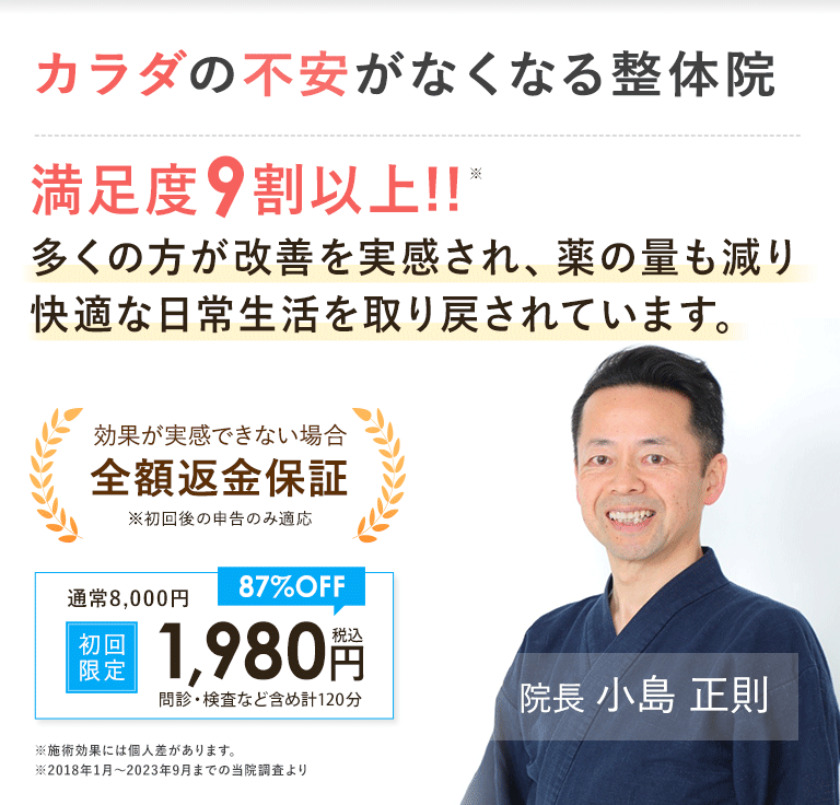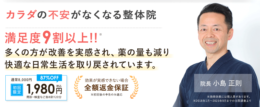 | 初回の料金 | 8,000円(税込み) (初検料0円+施術料金8,000円) ⇒ 1,980円(75%OFF) |