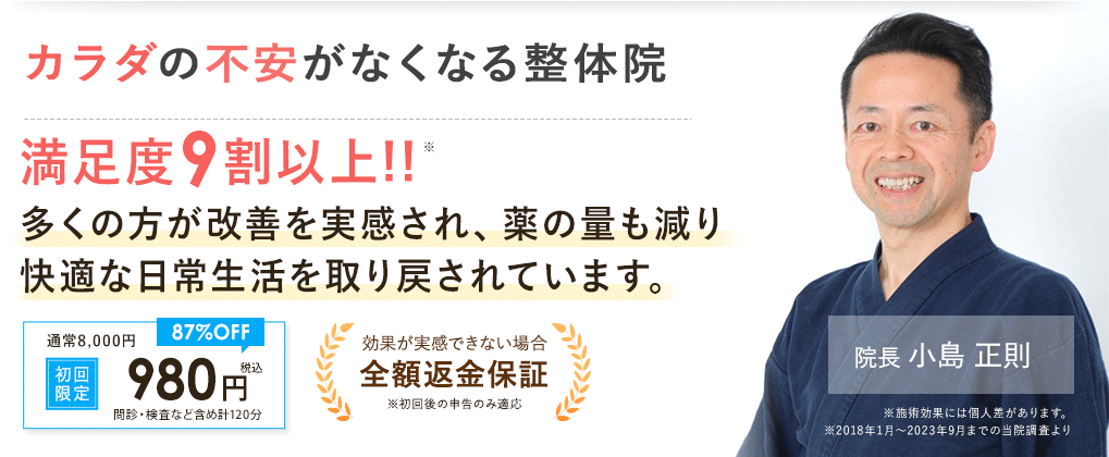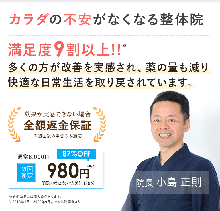 | 初回の料金 | 8,000円(税込み) (初検料0円+施術料金7,000円) ⇒ 1,980円(75%OFF) |